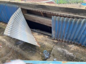 そして次に、下の瓦棒葺き屋根も撤去していきます。このように一度カバー工法された屋根は、葺き替えをするしかなく、その際に二層になった屋根を撤去する必要があります。