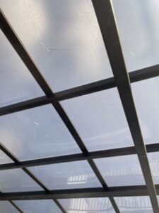 現地の状況を確認すると、カーポートに穴やひび割れがあったため、衝撃に強いポリカーボネートへの張り替えをご提案させていただきました。