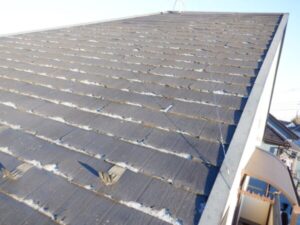 現地調査を行ったところ、既存の屋根材はニチハ製の「パミール」で、表面の層が剥がれたり、下端がめくれ上がるといった典型的な劣化症状が確認されました。