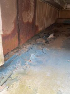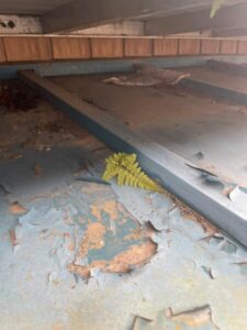 雨漏りの原因となった外壁との取り合い部は特に腐食が進んでおり、下屋根の塗膜も完全に剥がれてきています。