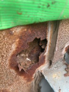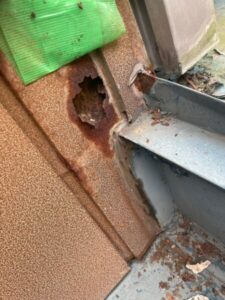 また、下屋根の塗膜が剥がれ、外壁の一部には錆による穴あきも見受けられました。