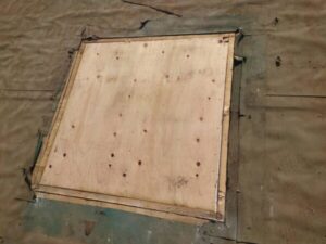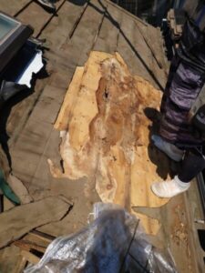 天窓は合板で塞ぎ、新たに全体にルーフィングシート(防水シート)を敷いていきます。