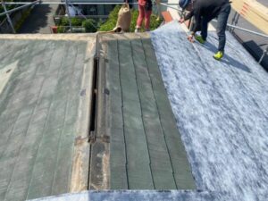 棟板金を設置することで、屋根材同士の隙間から雨水などが侵入しないようになっているのですが、こちらも撤去していきます。