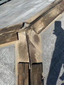 これは棟板金を固定するために下地として設置されるものですが、こちらがすでにボロボロで、触ると崩れてしまうほどに腐食していました。