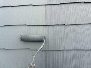 高圧洗浄で可能な限り屋根の汚れを落としてから、塗料を塗っていきます。
