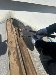 これは棟板金を固定するために下地として設置されるものですが、こちらがすでにボロボロで、触ると崩れてしまうほどに腐食していました。