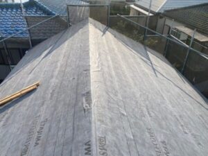 最初に屋根の上から防水シートを設置します。