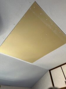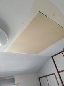 目立たぬよう天井と同様のクロスを貼って塞いでいきます。