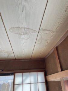 雨漏りのように実際に水滴が落ちてこないとそのままにしがちですが、雨染みをしているということは屋根に何らかの損傷があり、屋根裏で雨漏りになっている可能性があります。