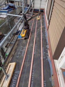 防水シートの上から一定間隔で桟木を設置します。