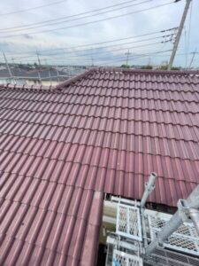 このままですと、既存瓦との色の違いが目立ってしまうため、差異をなくすため塗装をおこないました。