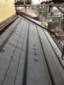 割れている瓦もありましたので、その部分は別のものにに交換させていただき、土台の野地板と、防水シートを新設した上で既存瓦を設置する「葺き直し」をおこなっていきます。
