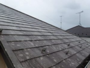 屋根はスレートをご使用になられていましたが、全体的に色褪せたうえに、斑点状のカビが多く、広がっています。