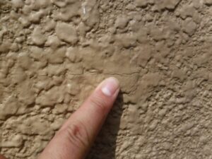紫外線や雨水で、塗装面が劣化し、塗料の顔料が浮き出ています。