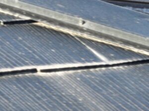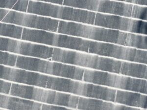 全体的に、色褪せている上に、屋根材ごとの端が白くなり、白い線がひかれているように見えます。
