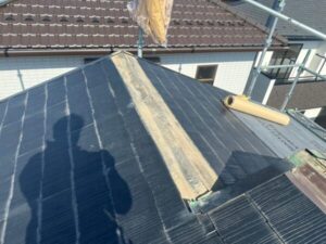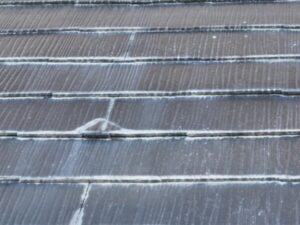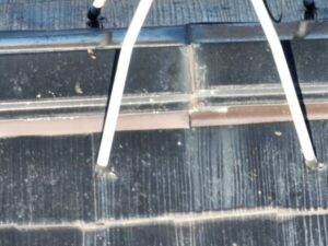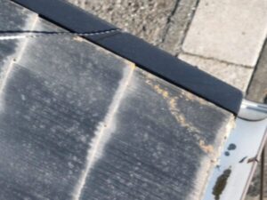 屋根頂上部分の棟板金の繋ぎ目は、埋められていたシリコン材が変色しているのが分かります。