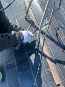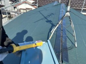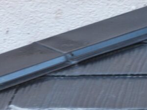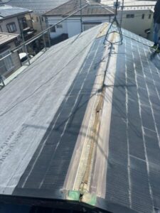 屋根頂上部分の棟板金の繋ぎ目は、埋められていたシリコン材が変色しているのが分かります。