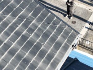 屋根材の劣化が激しく、スレート屋根にひびや、割れなどがありましたので、カバー工法で「スーパーガルテクト」を設置させていただきました。