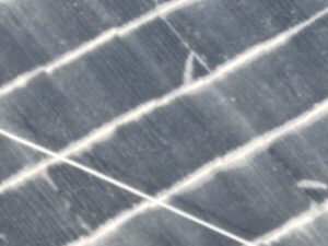 全体的に、色褪せている上に、屋根材ごとの端が白くなり、白い線がひかれているように見えます。