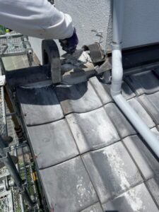 棟となっている箇所にも漆喰を埋めて、こちらも上から既存瓦を設置します。