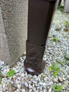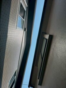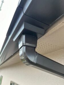 屋根に沿って「軒樋」、外壁に沿って「竪樋」、軒樋から流れてきた水を集め竪樋に流す「集水器」を先ほどの金具にはめ込み、雨樋の設置完了です!
