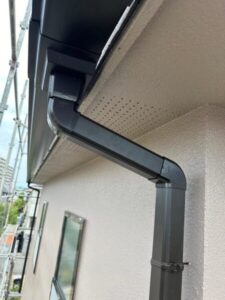 屋根に沿って「軒樋」、外壁に沿って「竪樋」、軒樋から流れてきた水を集め竪樋に流す「集水器」を先ほどの金具にはめ込み、雨樋の設置完了です!