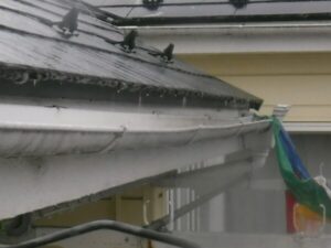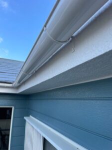 軒樋が住宅の外側に傾き、水がすぐにあふれてこぼれてしまうような状態です。