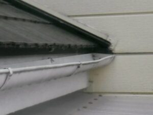 軒樋が住宅の外側に傾き、水がすぐにあふれてこぼれてしまうような状態です。