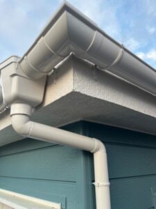 大きく歪んでいる二階部分の軒樋は新しいものに交換し、それ以外は塗装させていただきました。