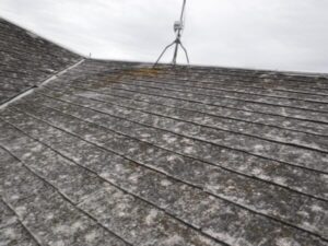 屋根材の劣化が進んでおり、白や黄色のカビが発生して、点状の模様が広がっています。