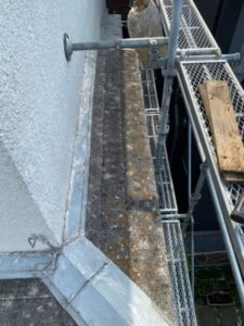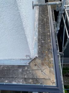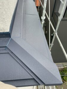屋根の端や、谷状となっている箇所などは、雨水が入り込みやすいので、専用の板金を使用して補強しています。