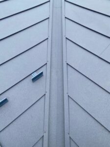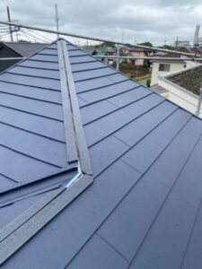 屋根が山状になっていて一番高い場所には「棟板金」とよばれる板金が設置され、雨水が入り込まないよう、屋根同士の隙間を覆っています。