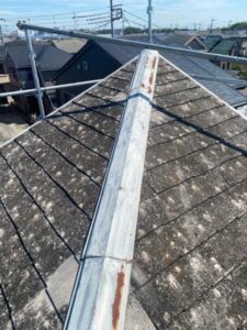 今回古い屋根材の上から新しい屋根材を設置する「カバー工法」での屋根修理をおこなうので、でっぱりが邪魔になるこちらの棟板金を外していきます。