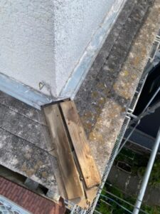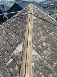 棟板金の土台の「貫板」が設置されていますが、黒く腐食しているのが分かります。